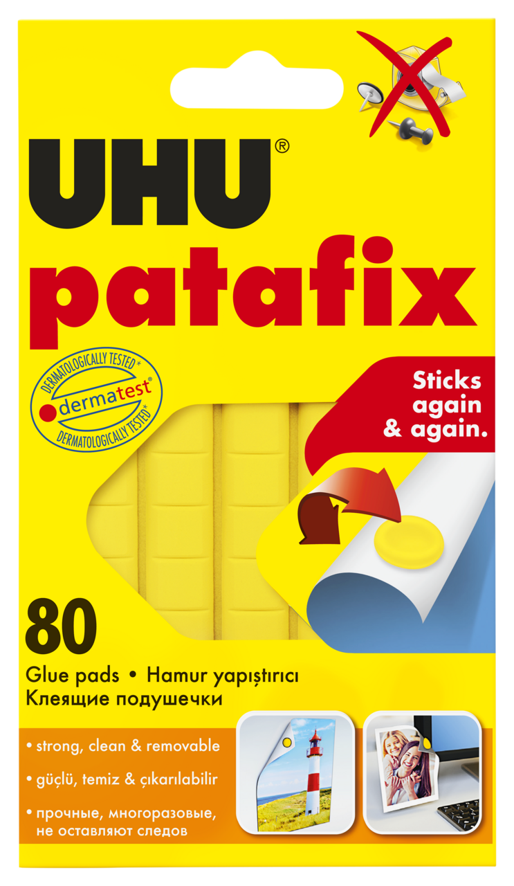 Avastage UHU patafix – nutikas ja kaasaegne alternatiiv traditsioonilistele nööpnõeltele, teibile ja klambritele. Need eemaldatavad ja mitmekordselt kasutatavad kleepuvad padjad pakuvad kiiret ja puhtaid lahendusi väiksemate esemete, nagu fotod, postkaardid, joonistused ja plakatid, kinnitamiseks erinevatele pindadele: seintele, ustele ja mööblile. UHU patafix sobib suurepäraselt nii koju, kooli kui ka kontorisse, pakkudes tuhandeid kasutusvõimalusi ruumi organiseerimiseks ja dekoreerimiseks.