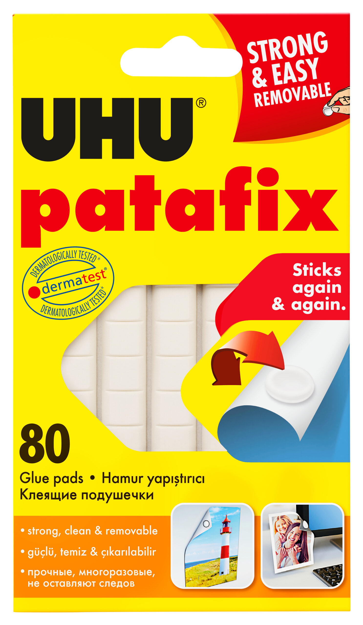 Avastage UHU patafix valged kleepmassid – nutikas ja korduvkasutatav alternatiiv tüütule liimile, teibile ja klambritele! Need 80 kleepuvat padjakest pakuvad kiiret ja puhast lahendust väiksemate esemete, nagu fotode, postkaartide, laste joonistuste või plakatite kinnitamiseks. Unustage inetud augud seintes ja kleepuvad jäägid – UHU patafixiga püsivad esemed kindlalt paigal, ilma pindu kahjustamata.